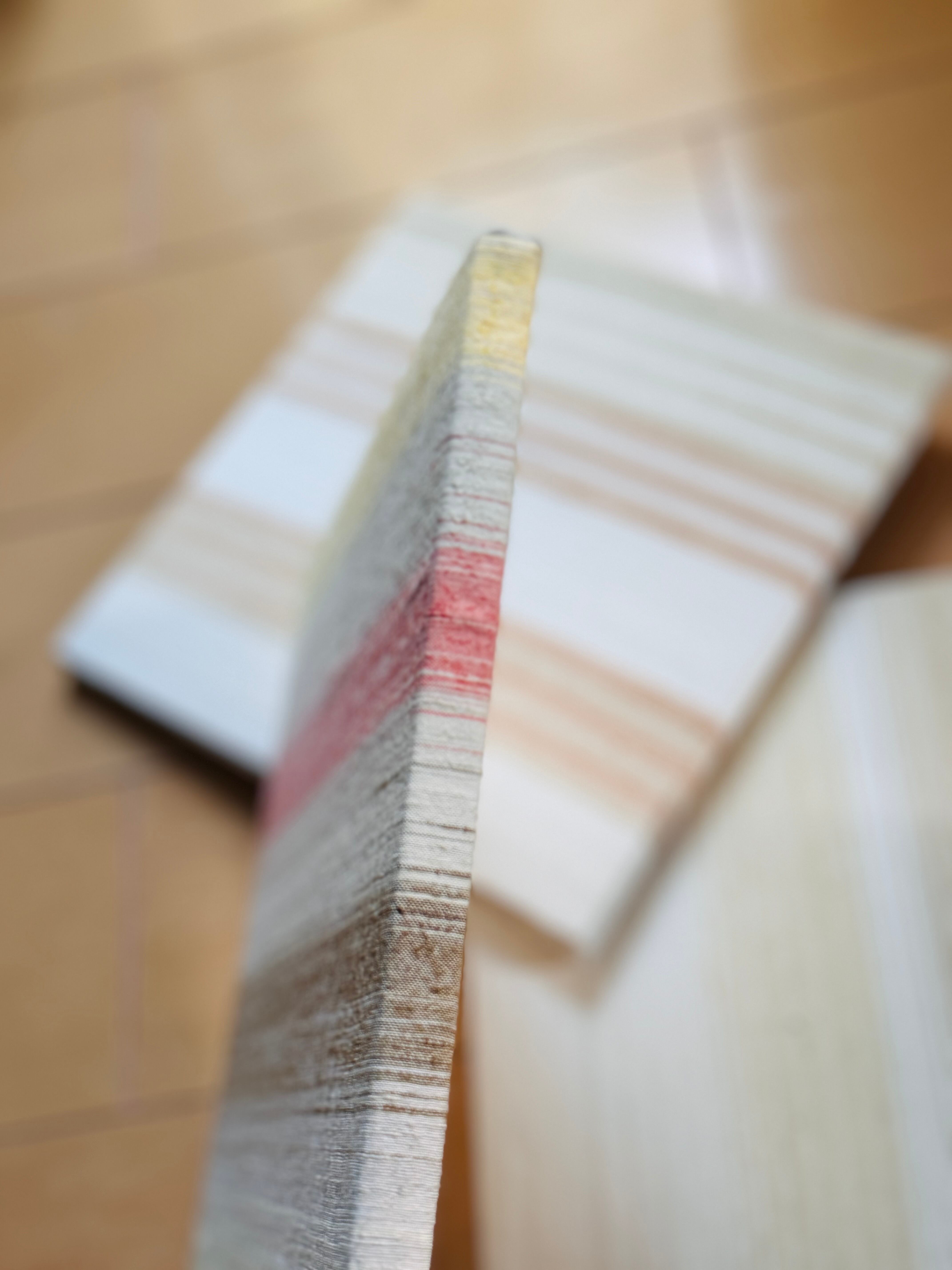 グレー地に黄色(染料クチナシ)赤(染料スオウ)茶(染料玉ねぎ)を織り込みました。