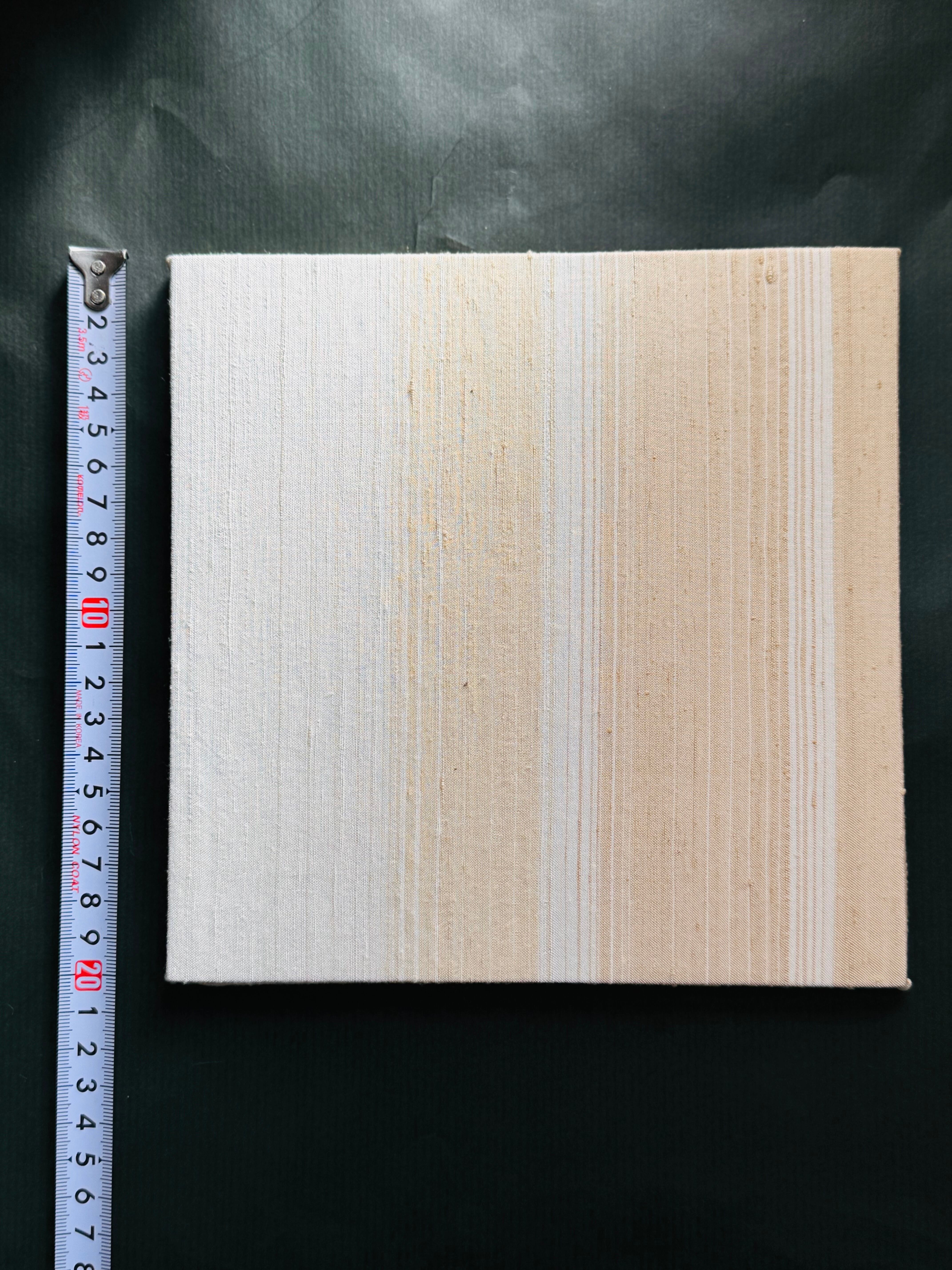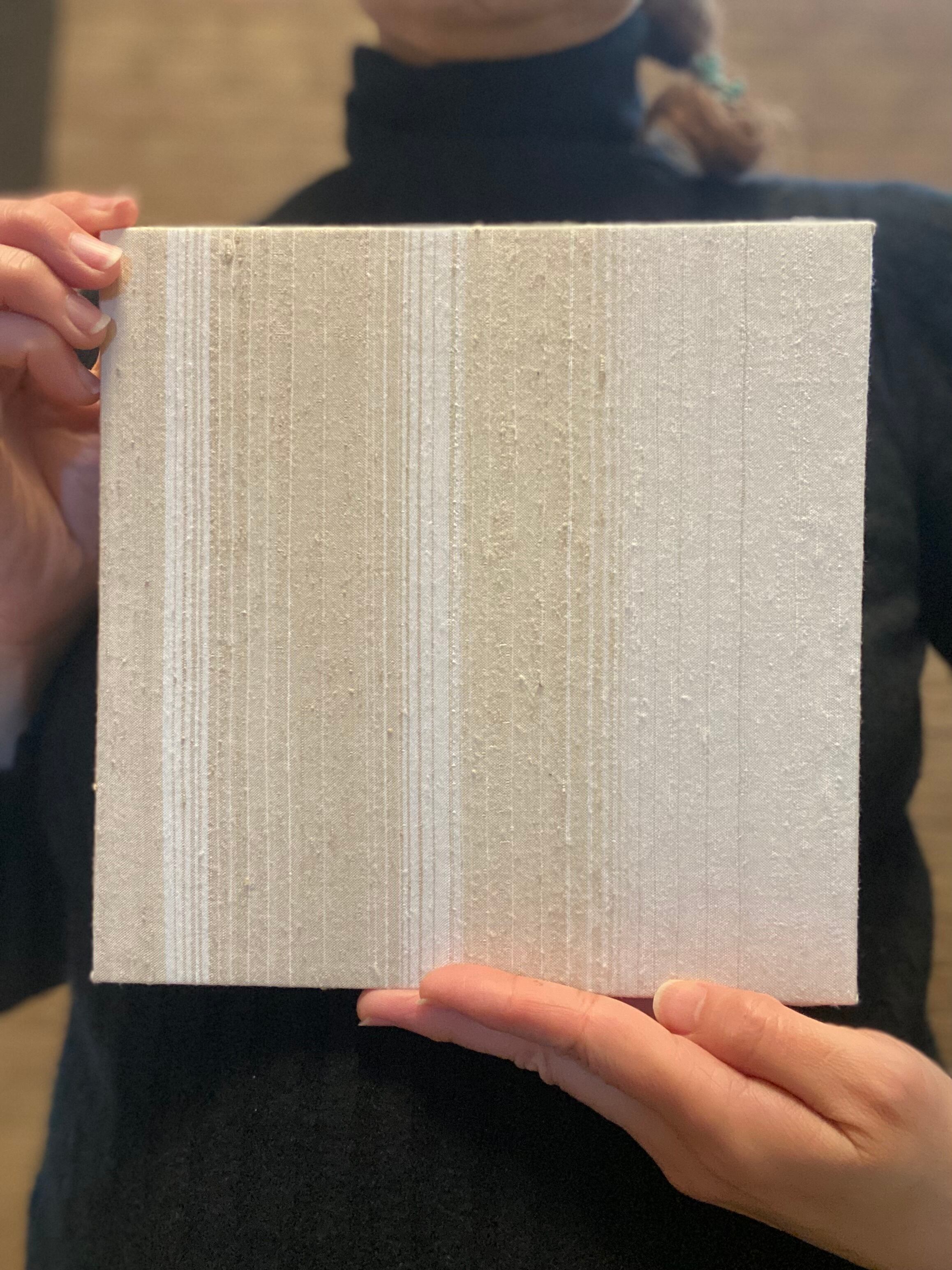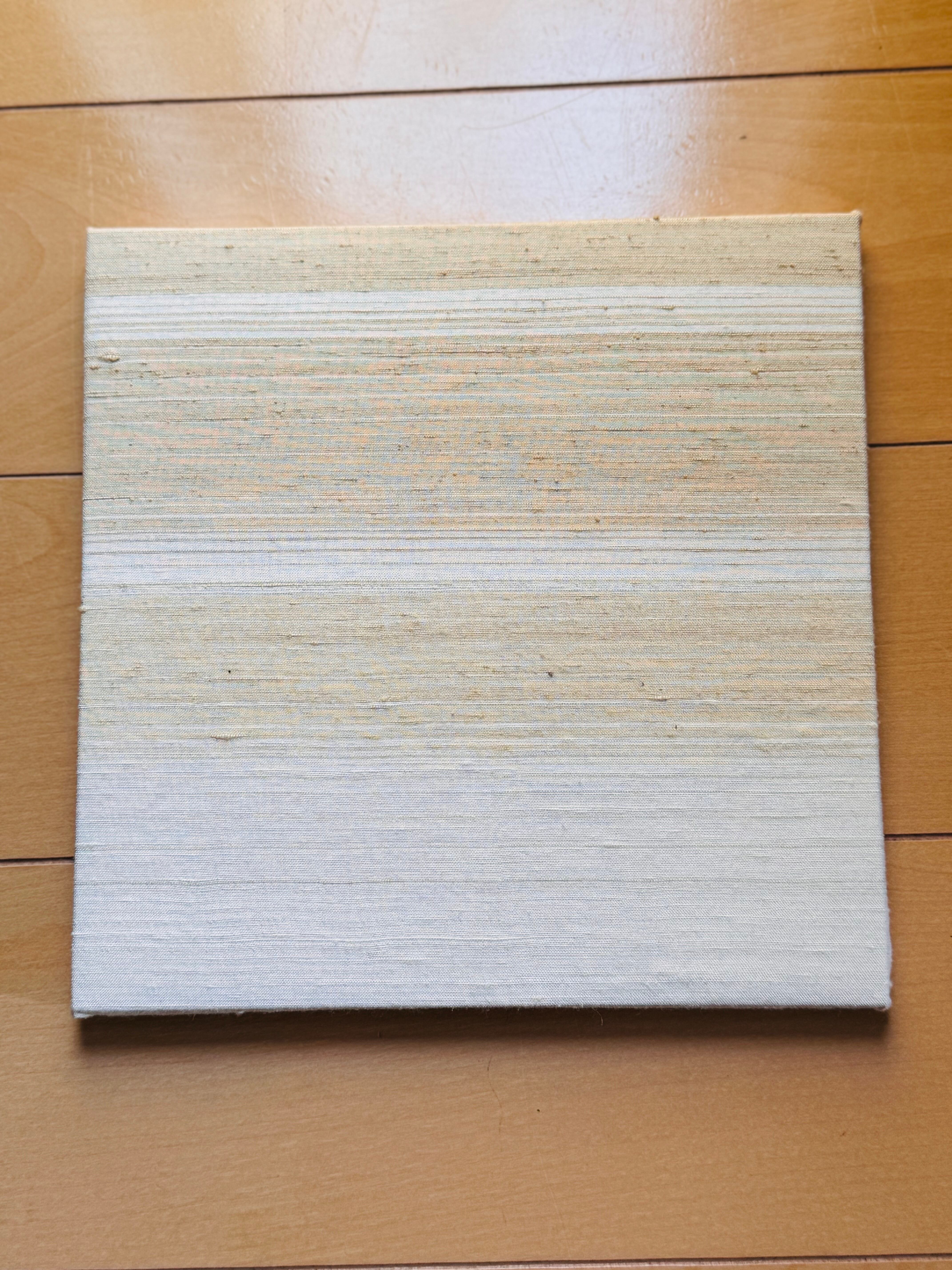 白地にうす茶や淡いグリーン(染料くず)を織り込みました。淡い色目の違いをお楽しみください。